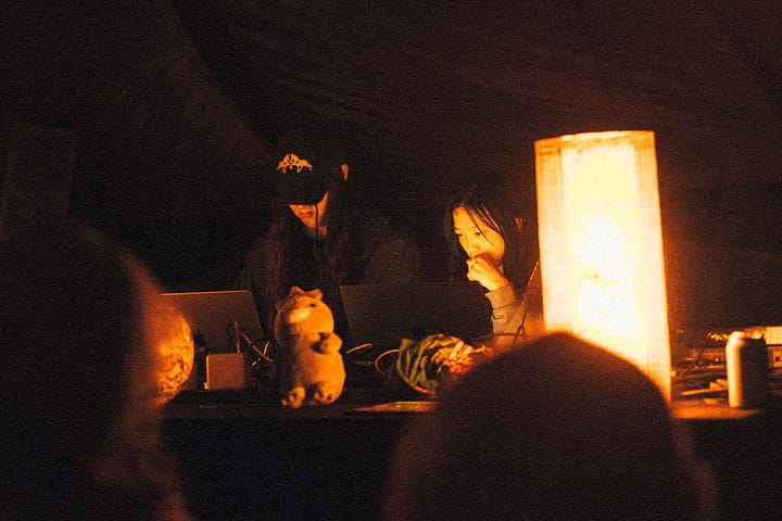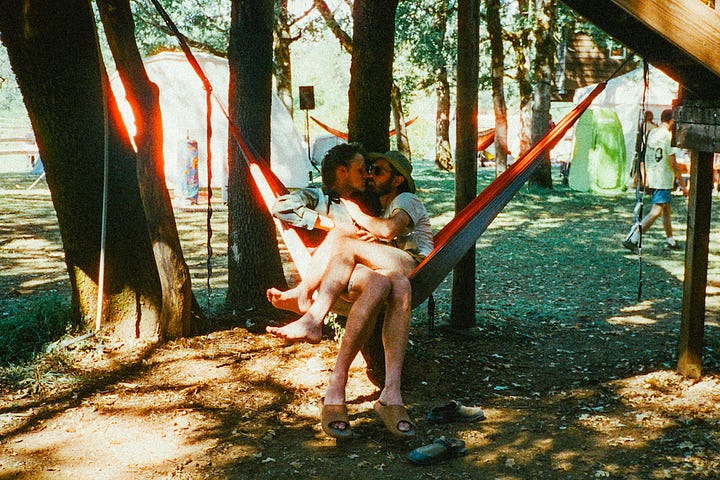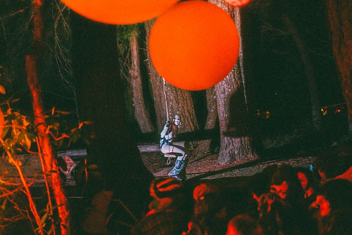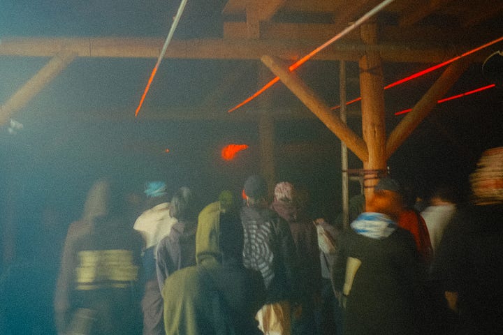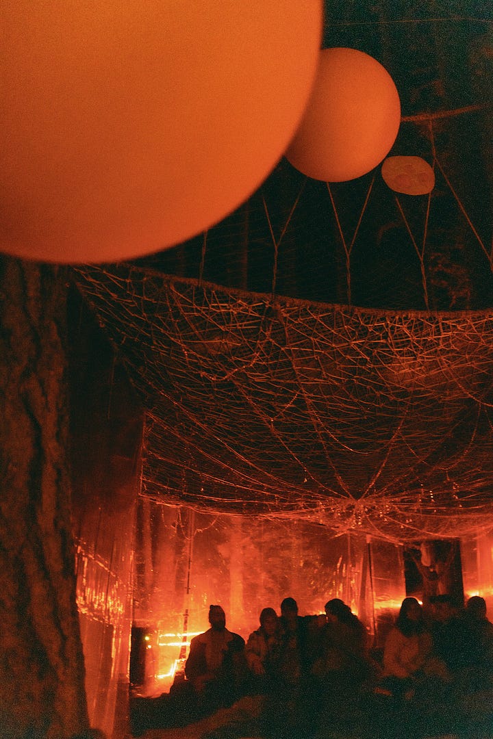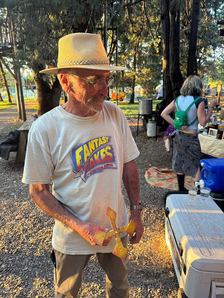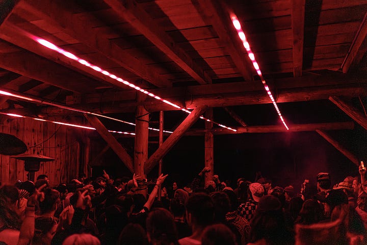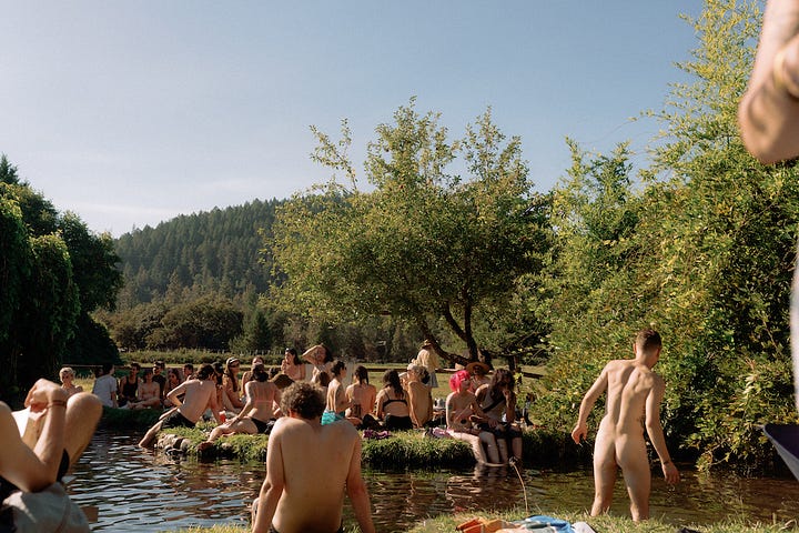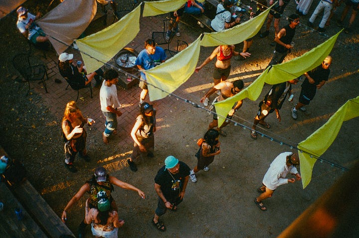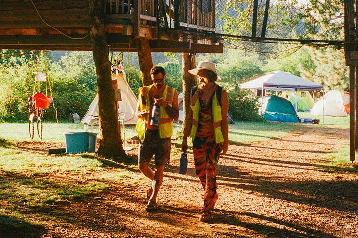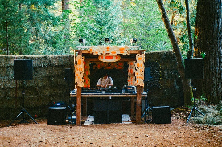“Our scene is small, we need all hands on deck in order to make it work,” said Mauve Decade, a queer Portland-based musician who became the scene’s unofficial lore-keeper after introducing himself to me at the swimming pool, mentioning that he stans this newsletter (cute!). “Everyone has to get their hands dirty in some way,” he continued. “There’s no room or reason to exclude the Burners, the hippies, the people who might not fit in at raves in bigger cities, where the aesthetics are more coherent.”