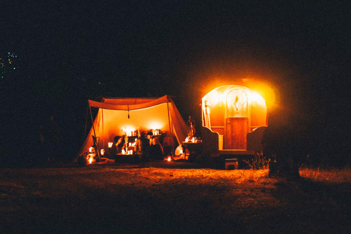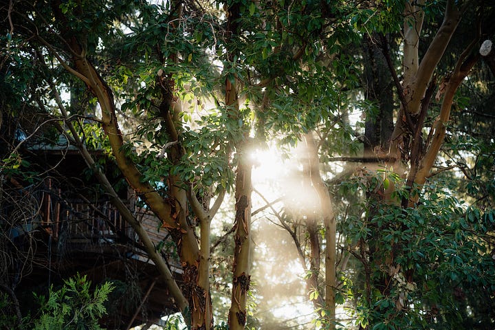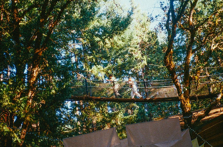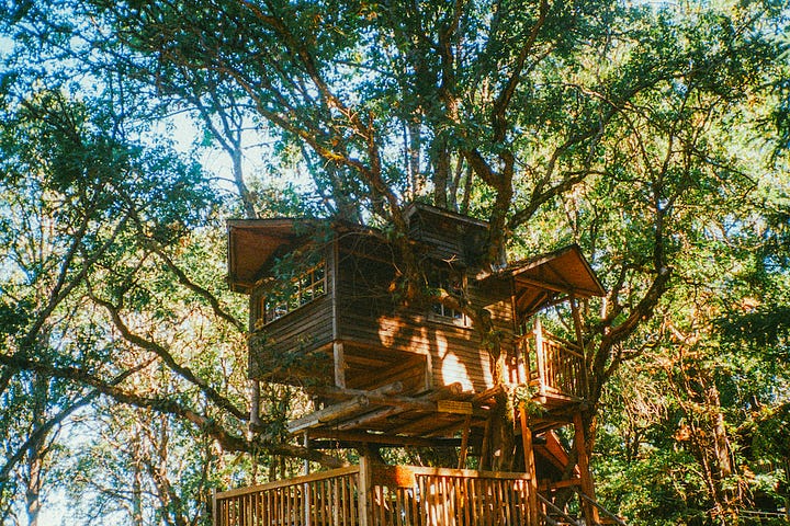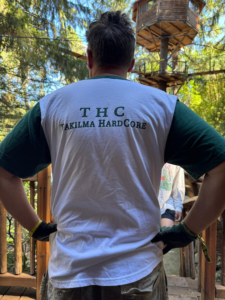 My partner and I had hitched a ride with DJs playing the festival, and the van spat us out in festival grounds. A dozen treehouses were suspended 35 to 50 feet in the air, abutting the limbs of some of the oldest oak trees in the country. During the rest of the year, these handbuilt cabins operate as a family resort and jam band concert venue called Out N About Treehouse Treesort. Some of the treehouses were connected by swinging suspension bridges; others had elaborate stained glass windows and pulley systems for luggages. It was giving full Robinson Crusoe fantasy: a DIY utopia built by an enterprising pot farmer named Michael Garnier, who spent years fighting with the authorities for the right to live off the land and in the trees.