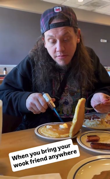 The neo-wook paradigm started to crystallize in my mind. If wooks are the brain-glazed love children of the hippie drop-out generation, neo-wooks are what happens when that archetype meets today’s post-club moment. Neo-wooks aren’t rejecting the wook completely—they’re just metabolizing “so stupid it’s genius” stoner wit through savage memes, and leaning into cringe tropes via the chaotic logic of the internet. Self-aware yet spiritually curious, the neo-wook chooses mind-melting debauchery because he knows there’s no way to truly exit the system. Yet, both the wook and neo-wook know a secret about resisting the late-capitalist logic of hyper-optimization. Fuck the microdose, they say, reveling in the ecstasy of going all the way in.
